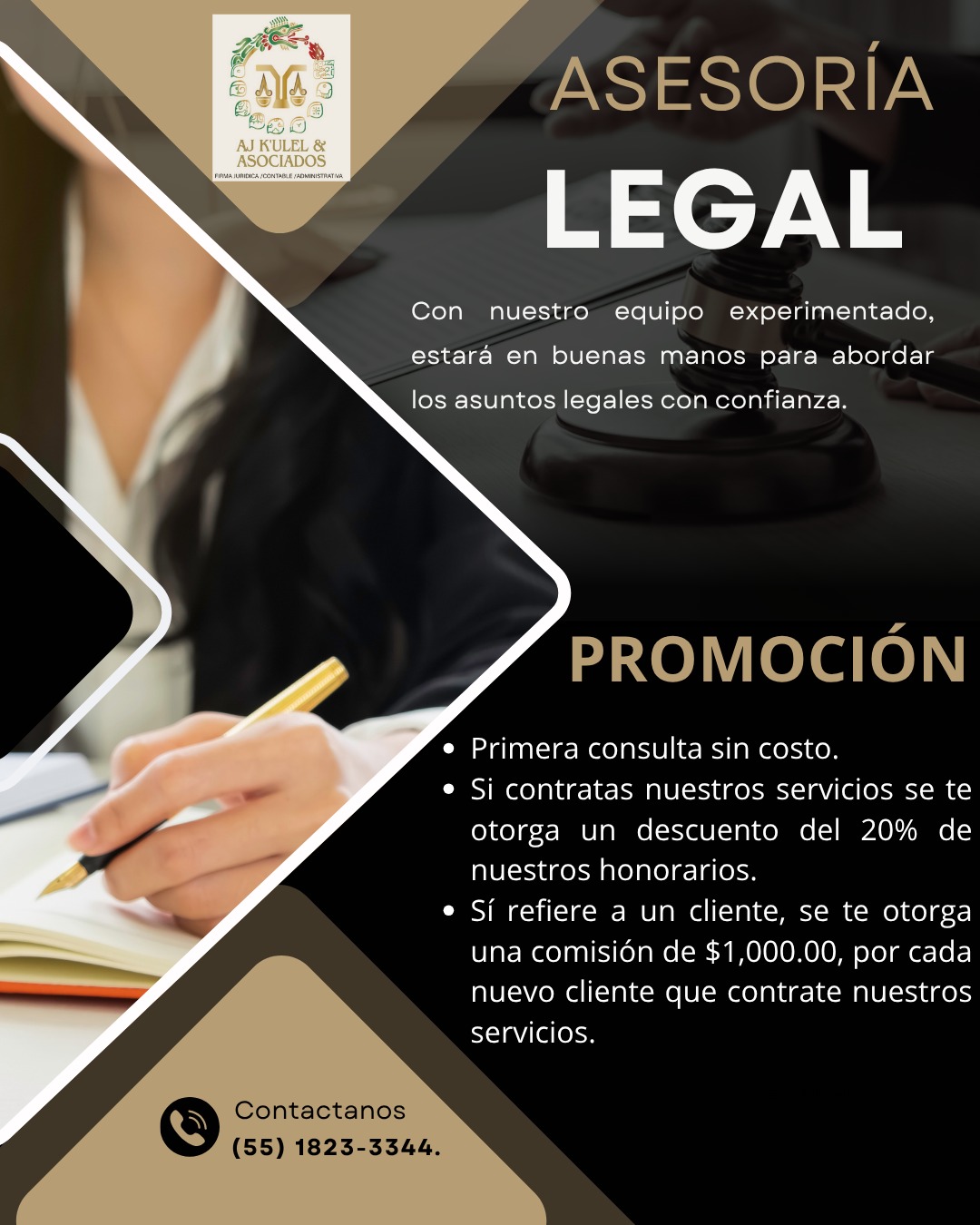 Primera consulta sin costo. Si contratas nuestros servicios se te otorga un descuento del 20% de nuestros honorarios. Si refiere a un cliente, se te otorga una comisión de $1,000, por cada nuevo cliente que contrate nuestros servicios